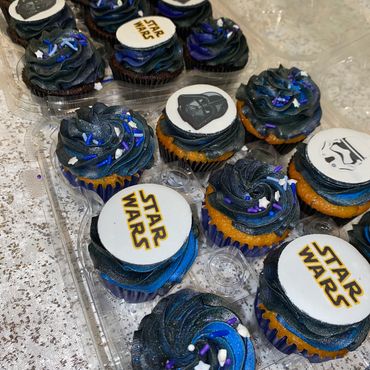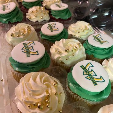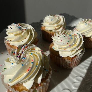 Six vanilla cupcakes with creamy swirled frosting on a white plate.