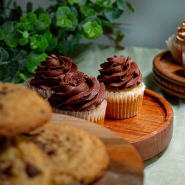 Close-up of six chocolate cupcakes with rich swirled frosting on a white plate.